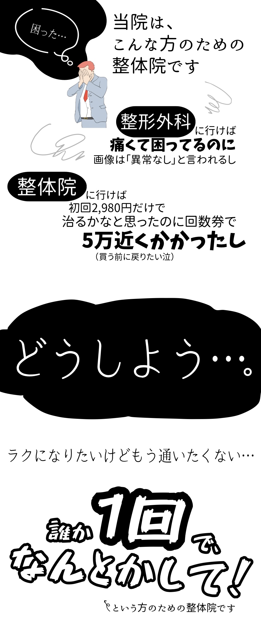 背中、お尻まで痛い方は1回で痛み改善はお約束できません。