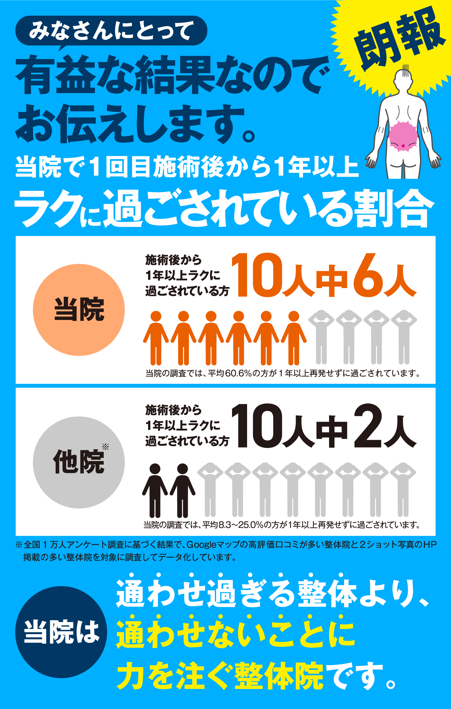 【参考】全国1万人アンケートでも、 ヘルニアを含む腰痛では、他院では10人中2人前後しか、 1年ラクが続かなかった方が多く見られました。