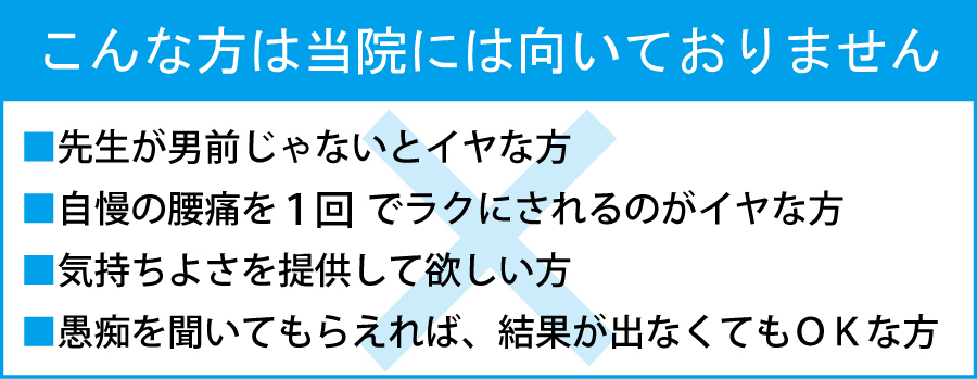 背中、お尻まで痛い方は1回で痛み改善はお約束できません。